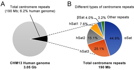Human centromere repeats. (A) The percentage of total centromere repeats in the Telomere-to-Telomere (T2T) CHM13 human genome []. A complete hydatidiform mole (CHM) arises from the loss of the maternal complement and duplication of the paternal complement postfertilization. Therefore, most CHM genomes are homozygous diploids. CHM13 is a cell line originally isolated from a CHM at Magee-Women’s Hospital (Pittsburgh, PA, USA). (B) The percentage of each type of satellite repeat sequence [] in the total centromere repeats of 190 Mb.
