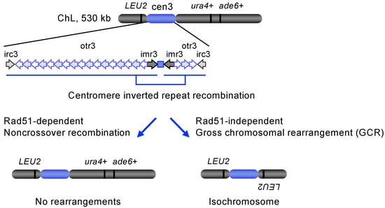 How does the Rad51-Rad54-dependent recombination suppress isochromosome formation? The Rad51-Rad54-dependent recombination promotes noncrossover recombination, thereby suppressing isochromosome formation []. Homologous recombination can be divided into two modes: crossover and noncrossover recombination. The reciprocal or nonreciprocal exchange of chromosome regions defines crossover recombination. In contrast to crossover, the flanking regions do not exchange in noncrossover recombination. Physical analysis of recombination products revealed that Rad51 and Rad54 preferentially promote noncrossover recombination between DNA repeats at a centromere []. Crossover recombination between centromere inverted repeats likely results in isochromosome formation or the inversion of the central region (i.e., cnt). Indeed, the loss of Mus81, a structure-specific DNA endonuclease that preferentially causes crossover [,,], reduces the isochromosome formation and inversion in rad51 deletion cells [].