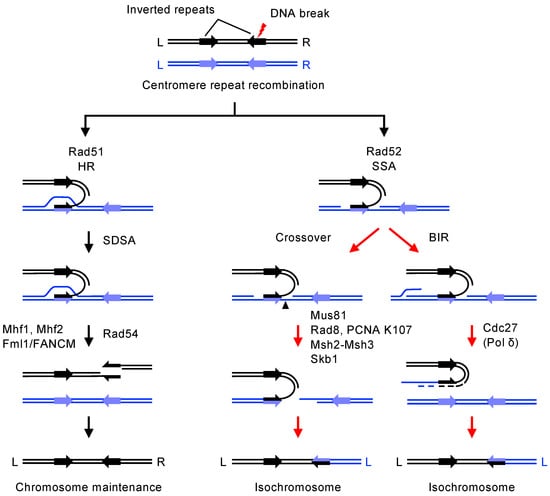 In fission yeast, recombination between centromere inverted repeats can result in isochromosome formation (Figure 4, the right arrow). Detailed analysis of isochromosomes found their breakpoints present in centromere repeats [,], demonstrating that homology-mediated DNA recombination between centromere inverted repeats creates isochromosomes. At least one-third of isochromosomes formed in wild-type cells had their breakpoints in the heterochromatin domain [], showing that recombination in heterochromatin can result in GCR. Rad51-dependent recombination safeguards centromere integrity (Figure 4, the left arrow), whereas Rad51-independent recombination causes GCR resulting in isochromosome formation (Figure 4, the right arrow) []. The loss of Rad51 greatly increased the spontaneous formation of isochromosomes []. Rad51 may process spontaneous DNA damage formed during DNA replication, as Rad51 binds to a centromere in the S phase []. Rad51 suppresses isochromosome formation even when a DSB is introduced outside a centromere []. Extensive degradation of DSB ends reaching a centromere repeat may initiate isochromosome formation. Rad51 paralogs Rad55 and Rad57 [,], the Mre11-Rad50-Nbs1 (MRN) complex [], and Exo1 suppress the DSB-induced isochromosome formation. In addition to isochromosome formation, Rad51 suppresses chromosomal truncation with de novo telomere addition either inside or outside a centromere [,,,]. A growing number of DNA repair and recombination proteins have been shown to play roles at centromeres (Table 2).