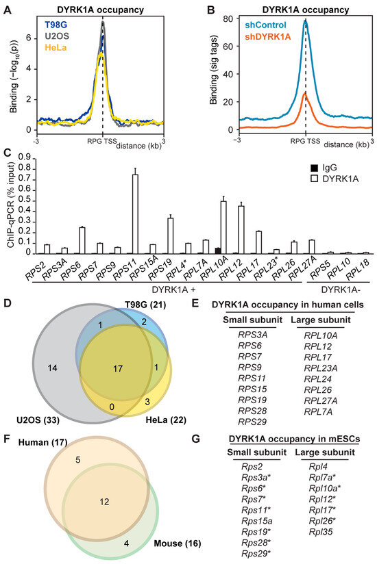 DYRK1A occupies a subset of RPG promoters. (A) Distribution of chromatin-bound DYRK1A relative to the TSS of human RPGs in T98G, U2OS and HeLa cells. The y-axis represents the relative protein recruitment (−log10 Poisson p-value) and the offset was set to ±3 kb from the TSS. (B) DYRK1A occupancy relative to the TSS of human RPGs, comparing the shControl and shDYRK1A T98G cells (blue and orange lines, respectively). The y-axis represents the relative protein recruitment quantified as significant (sig) ChIP-Seq tags. The offset was set to ±3 kb from the TSS (Figure S1B for representative examples). (C) Validation of the selected targets by ChIP-qPCR (percentage of input recovery; mean ± SD of three technical replicates). (D) Overlap of DYRK1A-associated RPG promoters in T98G, U2OS and HeLa cells. (E) List of DYRK1A-positive RPGs common to the three human cell lines. (F) Overlap between common DYRK1A-bound RPGs in the human cell lines and mESCs. (G) List of RPGs with DYRK1A detected at their promoters in mESCs. The asterisk indicates the coincident occupancy in mESCs with the three human cell lines analyzed.
