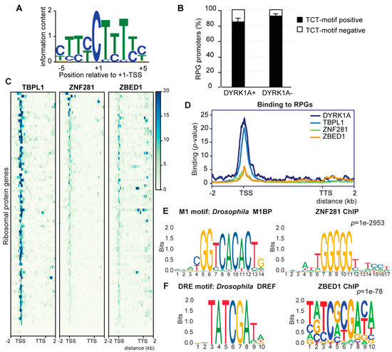 In Drosophila, the TCT element drives the recruitment of Pol II and, consequently, the transcription of RPGs through the coordinated action of TRF2, but not of TBP, and the TF motif 1 binding protein (M1BP) and DNA-replication-related element (DRE) factor (DREF) [14,15]. Thus, we asked whether the transcriptional regulators of the RPGs were functionally conserved between Drosophila and humans, and, if so, how they might be related to the DYRK1A promoter association. We analyzed the presence of the homologs of the fly TFs at the human RPG promoters: TBPL1, the homolog of TRF2; zinc finger protein 281 (ZNF281), the homolog of M1BP; and zinc finger BED-type containing 1 (ZBED1), the homolog of DREF. This analysis showed that TBPL1 binds to the promoter of most RPGs (68 out of 90 in K562 cells; Figure 3C,D; Table S9), similar to its behavior in Drosophila [14]; no particular enrichment was detected based on the presence or absence of a TATA box (Figure S3A). The presence of TBPL1 was detected at DYRK1A-positive and negative promoters (Figure S3B), and the results from an unbiased clustering analysis did not allow for the detection of the differential binding of TBPL1 at RPG promoters positive for DYRK1A (Figure S3C). ZNF281 was only detected at seven RPG promoters (Figure 3C; Table S9); in this regard, the sequence motif enriched within the ZNF281 ChIP-Seq dataset differed from the M1BP binding motif (http://jaspar.genereg.net/matrix/MA1459.1/ (accessed on 1 January 2021); Figure 3E) [10]; thus, we cannot assume that M1BP and ZNF281 are fully functional homologs. ZBED1 binds to several human RPG promoters and gene bodies (Figure 3C; Table S9), and the motif enriched in the ChIP-Seq dataset partially overlaps with the Drosophila DREF motif (http://jaspar.genereg.net/matrix/MA1456.1/ (accessed on 1 January 2021); Figure 3E). However, no enrichment for this motif was found within the human RPG promoters. ZBED1 might recognize the TCTCGCGAGA motif [40], yet the CMEA analysis did not find a unimodal and centered distribution of the TCTCGCGAGA motif within the ZBED1 ChIP peaks (Figure S3D). Hence, ZBED1 did not appear to bind directly to the TCTCGCGAGA motif, which is consistent with data suggesting that the TCTCGCGAGA motif and the human DRE are distinct regulatory elements [38]. No information on a general transcriptional effect of ZBED1 on RPGs is available other than that its depletion reduced the transcription of RPS6, RPL10A and RPL12 genes in human foreskin fibroblasts [40]. Finally, ZBED1 binding to human RPGs showed no particular correlation with the presence of DYRK1A (Figure S3E). Together, these data suggest that there is little functional conservation of the core promoter elements of RPGs between Drosophila and humans, either in cis or trans. Furthermore, the association to chromatin of the TF homologs to those identified in Drosophila does not appear to depend on the presence of the TCTCGCGAGA motif or the binding of DYRK1A to human RPG promoters.