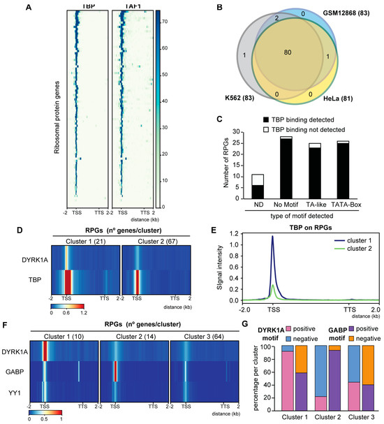 Analysis of TFs whose binding sites are over-represented at human RPG promoters. (A) TBP and TAF1 occupancy in human RPGs, showing the genomic region considered on the x-axis (K562 cells, GSE31477 and ENCSR000BKS). (B) Overlap of TBP occupancy at RPGs in different human cell lines (GSE31477). (C) Relationship of the presence of a TATA box or TA-like sequences in human RPG promoters according to Perry et al. (2005) [16] and TBP binding in HeLa cells (ND, not determined). (D) Unbiased k-mean clustering of the average binding of DYRK1A (HeLa, this work) and TBP (HeLa, GSE31477) on human RPGs. The color scale bar indicates the binding score and the genomic region considered is shown on the x-axis. (E) Metagene plot showing TBP occupancy relative to human RPGs in HeLa cells according to the clusters shown in Figure 4D. The y-axis represents the relative protein recruitment quantified as ChIP-Seq reads. (F) Unbiased k-mean clustering of the average binding of DYRK1A (T98G, this work), GABP and YY1 (SK-N-SH, GSE32465) to the RPGs. The color scale bar indicates the binding score and the genomic region considered is shown on the x-axis. (G) Percentage of RPG promoters containing a DYRK1A or a GABP motif in each of the clusters shown in Figure 4F.