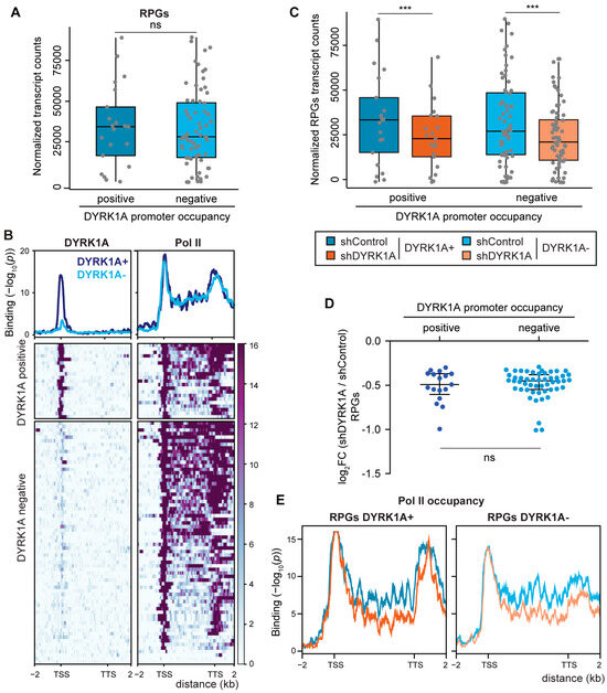 Depletion of DYRK1A causes a general reduction in RPG expression. (A) RNA levels of human RPGs (normalized counts) separated into two clusters according to the DYRK1A presence at their promoters (unpaired two-tailed Mann–Whitney test, ns = not significant). (B) Bottom panel, DYRK1A and Pol II chromatin occupancy of human RPGs depicted as metagenes and separated into two clusters according to the presence/absence of DYRK1A at the promoters. The binding score (−log10 Poisson p-value) is indicated by the color scale bar. Top panel, density plot corresponding to the mean value of the heatmap (blue and light-blue lines correspond to DYRK1A-positive or DYRK1A-negative RPGs, respectively). The binding score (−log10 Poisson p-value) is indicated on the y-axis. (C) Expression of RPGs (normalized counts) in T98G cells classified according to the presence (positive) or absence (negative) of DYRK1A at their promoters, and comparing shRNA Control cells (blue and light-blue, respectively) or shDYRK1A (orange and light-orange, respectively; Wilcoxon matched-pairs signed-ranks test, *** p < 10−5). The reduction in DYRK1A is shown in Figure S7B. (D) The graph presents the log2FC for the RPG mRNAs (adj p-value < 0.05) in shDYRK1A vs. shControl and clusterized according to DYRK1A presence at their promoters (two-tailed Mann–Whitney test, ns = not significant). (E) Density plots corresponding to the mean value of Pol II binding in RPGs clusterized as positive and negative for DYRK1A binding in shControl (blue and light-blue lines) and shDYRK1A conditions (orange and light-orange lines).