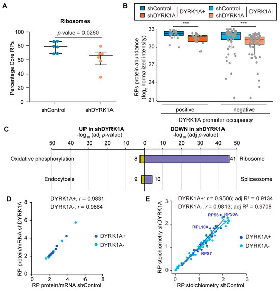 We next focused on the alterations induced by silencing DYRK1A. The datasets revealed significant differences in proteins associated with specific functional categories in the ribosomal-enriched fractions from the control and DYRK1A-depleted cells. Proteins in the oxidative phosphorylation category were enriched in the shDYRK1A cell fraction (Figure 6C), including components of the mitochondrial electron transport chain (COX6B1, COX7A2L, SDHB) or mitochondrial ATP synthases (Table S10). Conversely, the ribosome category was enriched in the protein dataset reduced in the fraction from shDYRK1A cells (Figure 6C; Table S10). Indeed, DYRK1A depletion significantly reduced the total ribosome mass when calculated relative to the total amount of protein in the fraction analyzed by MS (Figure 6A). In accordance with the general effect of DYRK1A on the RPG transcript levels, less RP amounts were found for the RPGs containing or lacking DYRK1A at their promoters (Figure 6B and Figure 6B and Figure S9A,B). Notably, the rRNA content tended to fall (Figure S9D), supporting the decrease in the ribosome amounts. The protein/mRNA ratios correlated strongly between the control and DYRK1A-silenced cells (Figure 6D), suggesting that changes in the protein abundance were largely due to the changes in the RNA abundance upon DYRK1A depletion. Finally, no big differences in the RP stoichiometry were observed between the shControl and shDYRK1A cells (Figure 6E; RPL22L1, p-value = 0.022; RPL27, p-value = 0.0411; two-tailed unpaired Mann–Whitney). All these results indicate that cells respond to DYRK1A depletion by reducing the steady-state levels of the RPs, and that this effect occurs, at least in part, at the transcript level.