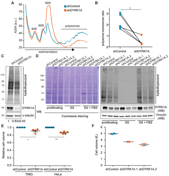 DYRK1A-dependent regulation of protein synthesis might impact cell size. (A) Polysome profile of T98G cells in shDYRK1A (orange line) and shControl (blue line) conditions. The position of the 40S, 60S, 80S and polysome peaks is indicated. The y-axis shows absorbance at 254 nm in arbitrary units and the x-axis corresponds to the different fractions. (B) The area under the curve for polysomes and monosomes was measured from the polysome profiles of paired shControl and shDYRK1A experiments, and the polysome:monosome ratio was calculated (the values for each condition in each biological replicate are represented with a color-coded dot and connected with lines; n = 5, shDYRK1A.1 [3] and shDYRK1A.2 [2]; Wilcoxon matched-pairs signed-ranks test, * p < 0.05). (C) Protein synthesis assays were performed by metabolic 35S-methionine labeling in shDYRK1A or shControl T98G cells. DYRK1A levels were analyzed by WB (Supplementary Materials). Quantification of the average radioactive intensity of independent experiments is shown at the bottom of the images (mean ± SEM, n = 3; Wilcoxon matched-pairs signed-ranks test, p < 10−3). (D) Autoradiography of protein extracts prepared from proliferating, serum-starved cells for 48 h (SS) or serum-starved cells reincubated with FBS for 30 min (SS + FBS) and pulse-labeled with 35S-Met for 20 min. Equal numbers of T98G cells infected with the indicated shRNA lentivectors were used. The reduction in DYRK1A was assessed in WB (Supplementary Materials) and a Coomassie-stained gel as a loading control is also shown. Cell cycle profiles are shown in Figure S10B. (E) Cell volume represented in arbitrary units with the control cells set as 1 (mean ± SEM; Mann–Whitney test, * p < 0.05, ** p < 0.01). (F) Cell volume of T98G cells infected with lentivirus expressing two independent shRNAs against DYRK1A or a shRNA Control (n = 2).
