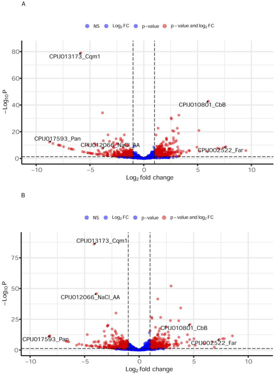 Volcano plots representing the genes found in larvae from two Bin-resistant Culex quinquefasciatus colonies (REC n= 5633, REC-2 n= 6434), compared to larvae from a susceptible colony (S). The plots were derived from RNA-seq and show the correlation between genes with log2 fold change (log2 FC) values ≥ 1 and FDR-corrected p-values ≤ 0.05. Genes with log2 FC values ≥ 1 and the respective p-values ≤ 0.05 are represent in red and listed in Table S4. Genes displaying only one cut off parameter, or genes that were not significant (NS), are represented in blue. (A) REC × S comparison. (B) REC-2 × S comparison. Genes that were subjected to the validation shown are indicated: Cqm1-Culex quinquefasciatus maltase 1; Pan-Pantetheinase; NaCl sodium/chloride-dependent amino acid transporter putative; CbB-Carboxypeptidase B precursor; Far-Farnesol dehydrogenase.