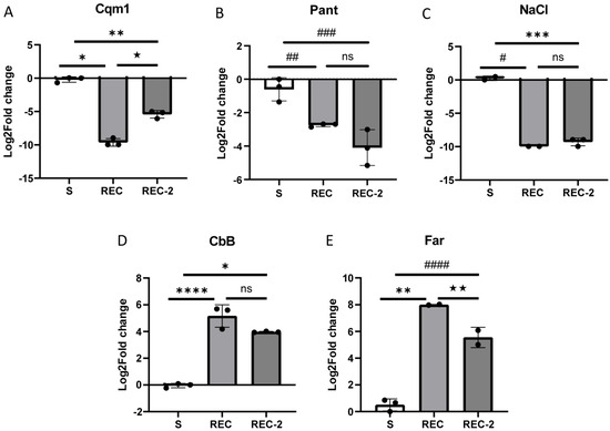 Relative quantification using RT-qPCR of the Culex quinquefasciatus transcripts from the Bin-resistant larvae (REC and REC-2) in comparison with those from the susceptible larvae (S). (A) cqm1 (Cqm1 CPIJ013173). (B) pantetheinase (Pan CPIJ017593). (C) sodium/chloride dependent amino acid transporter putative (NaCl CPIJ012066). (D) carboxypeptidase B precursor (CbB CPIJ010801). (E) farnesol dehydrogenase (Far CPIJ002522). Gene expression levels are relative to those from the endogenous control 18S gene used for normalization. Each column represents the mean with SEM obtained from three biological replicates from each colony. All values considered statistically different had p-values < 0.05 (* p = 0.0001, ** p = 0.0002, *** p = 0.0003, **** p = 0.0005, # p = 0.0006, ## p = 0.0061, ### p = 0.0091, #### p = 0.0024, ★ p = 0.0008, ★★ p = 0.0454), or they were not significant (ns).