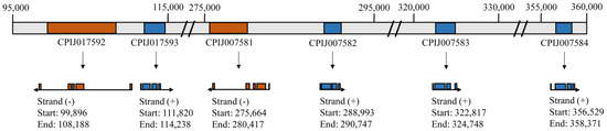 Organization of the pantetheinase genes annotated within the Culex quinquefasciatus genome. The scheme summarizes the genome data available at the VectorBase database (https://www.vectorbase.org accessed on 20 September 2023) for the two genome regions encoding the contiguous sets of six pantetheinase genes. The exon/intron organization for the corresponding coding sequences, the transcription start sites, and orientation of the various genes are indicated.