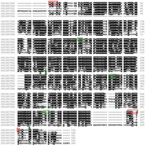 Amino acid sequence alignment of the Culex quinquefasciatus pantetheinases available at Vectorbase (www.vectobase.org accessed on 20 September 2023). Identical and similar amino acids are shown in black and gray, respectively. Primers used for gene amplification (red boxes), N-glycosylation (green boxes), and O-glycosylation sites (arrows) are indicated in the CPIJ017593 sequence.