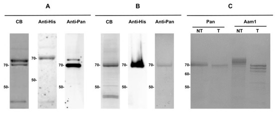 Recombinant expression of the pantetheinase CPIJ017593 from Culex quinquefasciatus and investigation of glycosylation events. (A) Recombinant protein expressed Escherichia coli. (B) The same protein expressed in Sf9 cells. For both systems, the proteins were purified with NI-NTA resin and visualized in 10% SDS-PAGE gels stained with Coomassie blue (CB). They were also detected through immunoblotting using monoclonal antibodies directed to the poly-hystidine tag (anti-His) or polyclonal antibodies raised against the recombinant pantetheinase (anti-Pan). (C) Endoglycosidase treatment of recombinant proteins from Sf9 cells: pantetheinase (Pan) and an α-glucosidase from Aedes aegypti (Aam1). Samples were incubated with the enzyme PNGase F at 37 °C during 4 h, separated on 10% SDS-PAGE, and visualized with CB. NT. Incubation without the enzyme. T. Incubation with the enzyme. Molecular weight markers (kDa) are on the left. Original Western blot images can be found in the Supplementary Material.