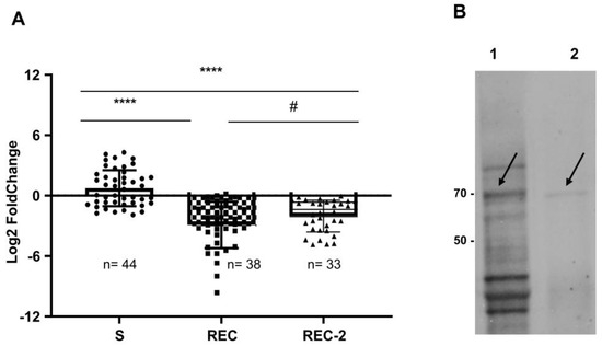 Abundance profile of the selected pantetheinase transcript (CPIJ017593) in Culex quinquefasciatus larvae. (A) Relative quantification of transcripts in individual larvae from the susceptible (S) colony compared to the Bin-resistant ones (REC, REC-2), by qRT-PCR. Each column represents the mean with SEM obtained from three biological replicates from each colony. Statistically significant differences (**** p < 0.001), or not (# p = 0.06), are indicated. (B) Immunodetection of proteins from brush border membranes preparations (BBMF) from susceptible larvae using the polyclonal antibodies raised against the recombinant CPIJ017593 pantetheinase. 1. BBMF prepared using whole larvae. 2. BBMF prepared using dissected midguts. Molecular weight markers (kDa) on the left. Arrows show the ~70 kDa proteins. Original Western blot images can be found in the Supplementary Material.