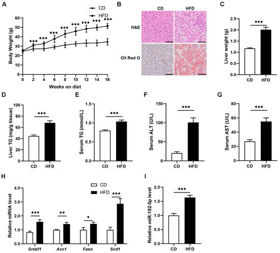 To investigate the biological effects of miR-192-5p in NAFLD, we first constructed a mouse model of NAFLD via HFD feeding for 16 weeks. As shown in Figure 1A, the body weight of NAFLD mice was significantly higher than that of control mice fed a chow diet (CD). H&E staining along with Oil Red O staining revealed enlargement of hepatocellular volumes and increased lipid accumulation in the liver tissues of NAFLD mice compared to CD mice (Figure 1B). As expected, the liver weight and triglycerides (TG) were increased in NAFLD mice (Figure 1C,D). Notably, NAFLD mice exhibited elevated serum TG levels (Figure 1E). Furthermore, alanine aminotransferase (ALT) and aspartate aminotransferase (AST) levels were increased, which acts as an indicator of intensified liver damage in NAFLD mice (Figure 1F,G). Next, we examined multiple hepatic DNL-related genes such as sterol regulatory element binding TF 1 (Srebf1), Acc1, Fasn, and Scd1 in the livers of NAFLD and CD mice using RT-qPCR. As shown in Figure 1H, expression levels of DNL-related genes increased. Then, we identified miR-192-5p expression levels in mouse liver tissues. Expression of miR-192-5p was significantly and visibly upregulated in the fatty livers of NAFLD mice versus the livers of CD mice (Figure 1I). Taken together, these results indicated that miR-192-5p expression was increased and was strongly associated with regulation of hepatic TG metabolism in mice with NAFLD.