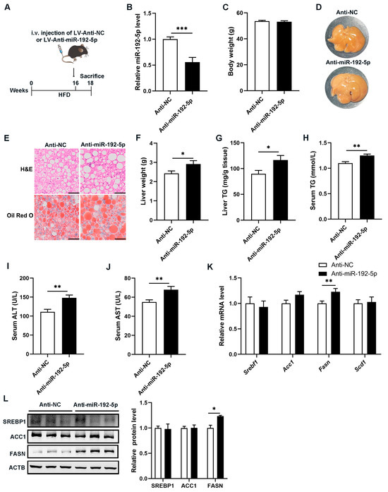 To further understand the biological function of miR-192-5p in hepatic lipid metabolism, we infected HFD-induced NAFLD mice with a lentivirus (LV)-miR-192-5p inhibitor or an LV-negative control (NC) via the tail vein (Figure 2A). Two weeks after injection, expression levels of miR-192-5p in mouse livers were detected using RT-qPCR. As shown in Figure 2B, the level of miR-192-5p in livers in the anti-miR-192-5p group was markedly lower than that in the anti-NC group, suggesting that the LV-miR-192-5p inhibitor had a high infection efficiency. Surprisingly, the repression of miR-192-5p in NAFLD mice resulted in aggravated liver steatosis and elevated accumulation of TG despite no significant difference in body weight (Figure 2C–E). Consistent with these findings, the liver weight and TG levels were increased in the anti-miR-192-5p mice (Figure 2F,G). Meanwhile, serum TG, ALT, and AST levels were further increased after LV-miR-192-5p inhibitor infection in NAFLD mice (Figure 2H–J). In addition, expression of Fasn, a key DNL enzyme, was increased in miR-192-5p inhibitor-treated NAFLD mice (Figure 2K,L). In summary, these results suggested that knockdown of miR-192-5p promoted an imbalance of TG metabolism caused by excess nutrients and aggravated hepatic steatosis in NAFLD mice.