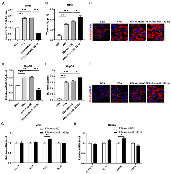 Knockdown of miR-192-5p promotes lipid deposition in hepatocytes. (A–H) Mouse primary hepatocyte (MPH) and HepG2 cells were transfected with miR-192-5p inhibitors or NC inhibitors and incubated with 0.4 mM free fatty acids (FFA, palmitic acid: oleic acid = 1:1) for 72 h (n = 3). The hepatocytes were treated with 0.5% bovine serum albumin (BSA) as a control (A–F). (A,D) The levels of miR-192-5p in MPH (A) and HepG2 cells (D). (B,E) TG levels in MPH (B) and HepG2 cells (E). (C,F) Lipid droplets stained with Nile Red (red) in MPH (C) and HepG2 cells (F) and DAPI (blue) for cell nuclei (Scale bar: 5 μm). (G,H) Relative expression levels of DNL-related genes in MPH (G) and HepG2 cells (H). The data are presented as the mean ± SEM. * p < 0.05, ** p < 0.01, *** p < 0.001.