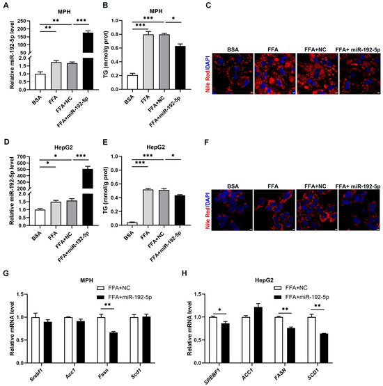 Overexpression of miR-192-5p decreased lipid accumulation in hepatocytes. (A–H) MPH and HepG2 cells were transfected with miR-192-5p mimics or NC mimics and incubated with 0.4 mM FFA for 72 h (n = 3). (A,D) The levels of miR-192-5p in MPH (A) and HepG2 cells (D). (B,E) TG levels in MPH (B) and HepG2 cells (E). (C,F) Lipid droplets stained with Nile Red (red) in MPH (C) and HepG2 cells (F) and DAPI (blue) for cell nuclei (Scale bar: 5 μm). (G,H) Relative expression levels of DNL-related genes in MPH (G) and HepG2 cells (H). Data are showed as mean ± SEM. * p < 0.05, ** p < 0.01, *** p < 0.001.