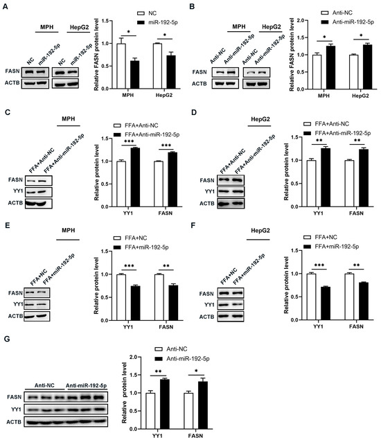 MiR-192-5p inhibited hepatic triglyceride synthesis in NAFLD mice by regulating the YY1/FASN pathway. (A,B) Protein levels of FASN in MPH and HepG2 cells transfected with miR-192-5p mimics (A) or inhibitors (B) for 48 h. NC mimics or inhibitors as a control (n = 3). (C,D) Protein levels of YY1 and FASN in MPH (C) and HepG2 cells (D) treated with miR-192-5p inhibitors and incubated with 0.4 mM FFA for 72 h. (E,F) Protein levels of YY1 and FASN in MPH (E) and HepG2 cells (F) treated with miR-192-5p mimics and incubated with 0.4 mM FFA for 72 h. (G) Protein levels of YY1 and FASN in the livers of NAFLD mice injected with LV-Anti-miR-192-5p or LV-Anti-NC for two weeks. Data are presented as mean ± SEM. * p < 0.05, ** p < 0.01, *** p < 0.001.