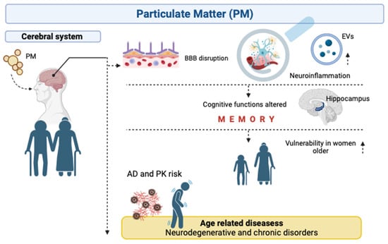 Overview of consequences in brain human by PM exposure. PM is capable of crossing blood–brain barrier and negatively affects the CNS by inflammation and EV deregulation. The result of such PM exposure is an impaired cognitive system during elderly, with higher vulnerability in women. Thus, it has been demonstrated an association between PM pollution and age-related diseases. Note: BBB, blood–brain barrier; PM, particulate matter; EVs, extracellular vesicles; AD, Alzheimer’s Disease and PK, Parkinson’s disease. Figure created with BioRender.com (accessed on 10 October 2023).