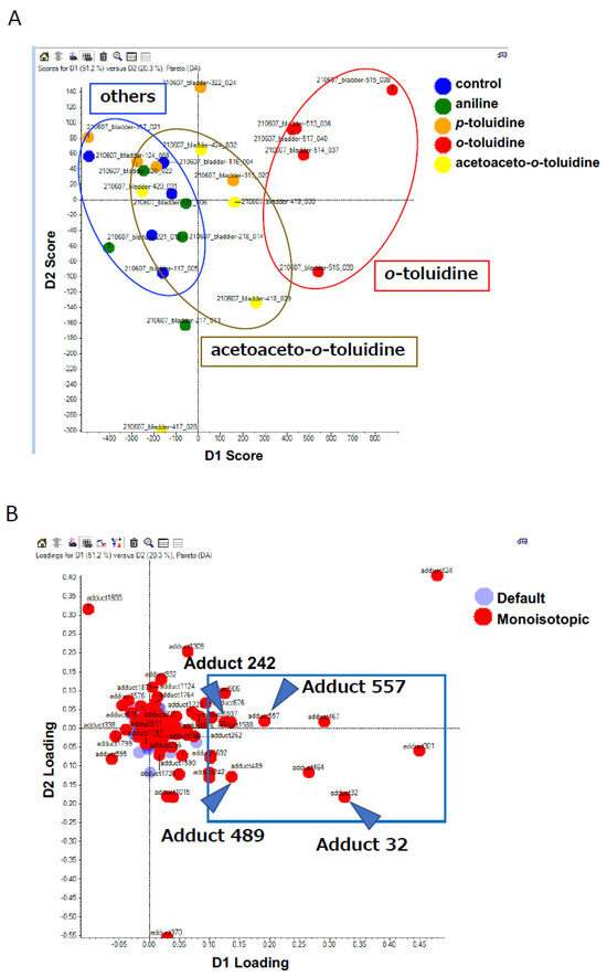 The mechanisms involved in the development of pre-cancerous lesions in the rat urinary epithelia after OTD and AAOT administration were determined via adductome analysis, as described previously [12,14]. Approximately 140 types of DNA adducts were detected in the control and AA derivative-treated groups. Results of the PCA–DA against a subset of DNA adducts observed in these data sets are shown in the 2D PCA–DA score plot (Figure 2A) and associated loading plot (Figure 2B).