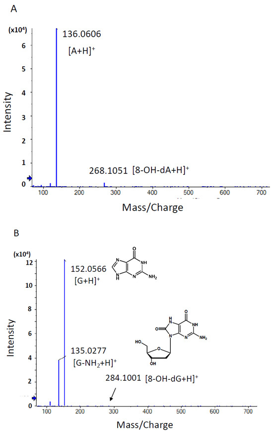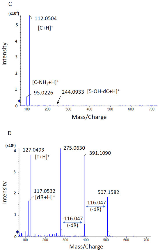 Our in-house DNA adduct database was used to identify the chemical structures of DNA adducts characteristic of OTD and AAOT exposure [14]. First, the m/z [M + H]+ values were compared with those of known DNA adducts listed in our in-house database. The m/z values of adduct_32 (m/z [M + H]+ 268.1051), adduct_242 (m/z [M + H]+ 284.1001), and adduct_489 (m/z [M + H]+ 244.0933) were nearly identical to those of 8-OH-dA (m/z [M + H]+ 268.1046), 8-OH-dG (m/z [M + H]+ 284.0994), and 5-OH-dC (m/z [M + H]+ 244.0933), respectively. Fragment ion peaks corresponding to adenine (m/z [A + H]+ 136.0606), guanine (m/z [G + H]+ 152.0566), and cytosine (m/z [C + H]+ 112.0504) were also observed in the MS/MS fragmentation data (Figure 4); therefore, it was concluded that these adducts were related to oxidative stress.