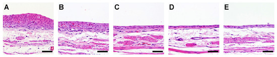 Histology of the rat urinary bladder epithelium treated with aromatic amines (AAs). Typical histopathological changes by AAs in the urinary bladder epithelium of the (A) untreated control, (B) aniline-treated rats, (C) p-toluidine-treated rats, (D) acetoaceto-o-toluidine-treated rats, and (E) o-toluidine-treated rats. Scale bar = 25 µm.