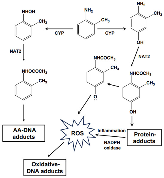 Recently, ten workers at a Japanese chemical plant handling AAs were diagnosed with bladder cancer [4]. All patients were exposed primarily to OTD and co-exposed to p-toluidine, o-anisidine, aniline, 2,4-xylidine, acetoacet-o-toluidine (AAOT), or o-chloroaniline. Thus, OTD was considered as the causative agent of occupational bladder cancer in this plant. In our previous study, we reported that AAOT, produced using OTD as a raw material, can promote urinary bladder carcinogenesis in rats [5]. In another study, we demonstrated high concentrations of OTD in the urine of AAOT-treated rats. These data suggest that OTD, a human bladder carcinogen [6] metabolized from AAOT, can play a pivotal role in bladder carcinogenesis; thus, metabolism is an important factor for analyzing carcinogenesis. The formation of DNA adducts might be crucial in the development of OTD-related bladder carcinogenesis. However, the formation of OTD-DNA adducts remains controversial due to the absence of adducts in previous in vivo studies [7,8,9].
