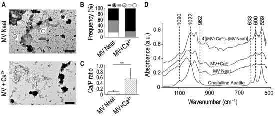 Electron microscopy and infrared analyses of matrix vesicles. Matrix vesicles were incubated in synthetic cartilage lymph devoid of Ca2+ (MV Neat) or supplemented with 2 mM Ca2+ (MV+Ca2+) for 24 h, then dried and analyzed by means of transmission electron microscopy coupled with X-ray. (A) TEM images (scale bars are 500 nm) of matrix vesicles devoid of (arrow empty circle), partially filled with (arrow partly filled circle), and fully filled with mineral deposits (arrow full filed circle). (B) Frequency of matrix vesicles devoid of (white area), partially filled with (grey area), and fully filled with (black area) mineral deposits. (C) Ca/P ratio of mineral deposits found in matrix vesicles incubated in synthetic cartilage lymph devoid of Ca2+ (MV Neat, hatched area) or supplemented with 2 mM Ca2+ (MV+Ca2+, cross hatched area) as measured by transmission electron microscopy coupled with energy dispersive X-ray spectroscopy. Statistical analysis was performed by Student’s t-test. ** p < 0.1(D) The top trace is the infrared spectrum for MV+Ca2+ after background subtraction of the MV Neat sample (middle trace) and subsequent amplification by a factor of four to better resolve the peaks. The bottom trace is the infrared spectrum of crystalline apatite as a control. Adapted from [107].