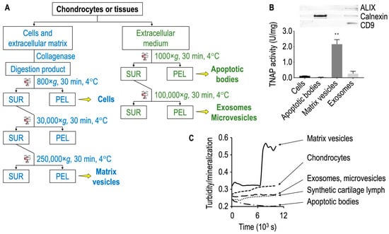 Matrix vesicles and media vesicles from primary hypertrophic chondrocytes. (A) Scheme of purification of matrix vesicles and media vesicles. (B) Top panel: Western blot of calnexin (marker of apoptotic bodies), Alix (marker of the syndecan-syntenin-Alix pathway associated with ESCRT-III), and CD9 (sometimes referred as endosomal marker). Matrix vesicles are distinct from media vesicles enriched with Alix and CD9. Bottom panel: TNAP specific activity of cells, apoptotic bodies, matrix vesicles and extracellular vesicles (mostly exosomes) indicating that MVs had the highest specific TNAP activity. Statistical analysis of TNAP specific activity of apoptotic bodies, matrix vesicles and extracellular vesicles vs cells was performed by Student’s t-test. ** p < 0.1. (C) Turbidity at 340 nm induced by the addition of 2 mM Ca2+ and 3.41 mM Pi in synthetic cartilage lymph containing either matrix vesicles, chondrocytes, or small- and medium-sized extracellular vesicles (including exosomes), or large-sized vesicles (apoptotic bodies). Only matrix vesicles induced a significant turbidity, suggesting mineral formation. (Adapted from [87]). Abbreviations: SUR = supernatant; PEL = pellet.