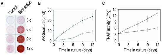 Mineralization by Saos-2 cells. (A) Saos-2 cells were incubated for 12 days in the absence (control) or presence of 50 µg/mL ascorbic acid and 7.5 mM β-glycerophosphate (stimulation), stained with Alizarin Red-S to detect calcium nodules and visualized under fluorescence microscope using transmitted light and phase contrast filter. (B) Alizarin Red-S was solubilized in control (grey trace) and stimulated (black trace) cell cultures by cetylpyridinium chloride and quantified at 562 nm (Results are mean ± SD, n = 3). (C) TNAP activity was calculated in control (grey trace) and stimulated (black trace) cell cultures. Adapted from [83].