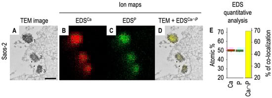 The accumulation of minerals inside the matrix vesicles embedded in bone tissues has been observed using electron microscopy [140,141,142]. Transmission electron microscopy coupled with X-ray microanalysis spectroscopy (TEM-EDS) of matrix vesicles released from Saos-2 cells indicated that Ca and P ions or elements co-localized inside matrix vesicles ([131], Figure 6).