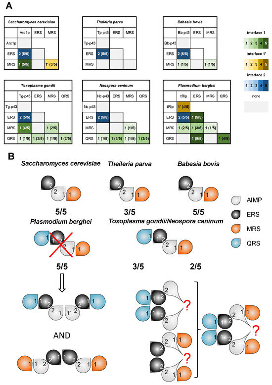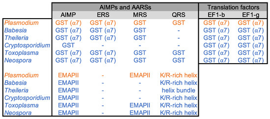 - van Rooyen, J.M.; Murat, J.-B.; Hammoudi, P.-M.; Kieffer-Jaquinod, S.; Coute, Y.; Sharma, A.; Pelloux, H.; Belrhali, H.; Hakimi, M.-A. Assembly of the Novel Five-Component Apicomplexan Multi-Aminoacyl-tRNA Synthetase Complex Is Driven by the Hybrid Scaffold Protein Tg-P43. PLoS ONE 2014, 9, e89487. [Google Scholar] [CrossRef] [PubMed]