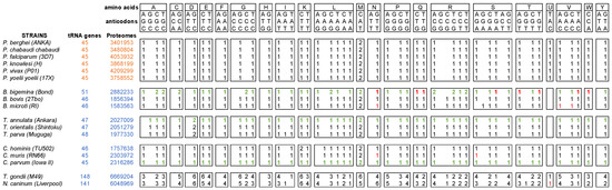 3.8. Correlation between Amino Acid Usage and tRNA Availability in Apicomplexa Parasites