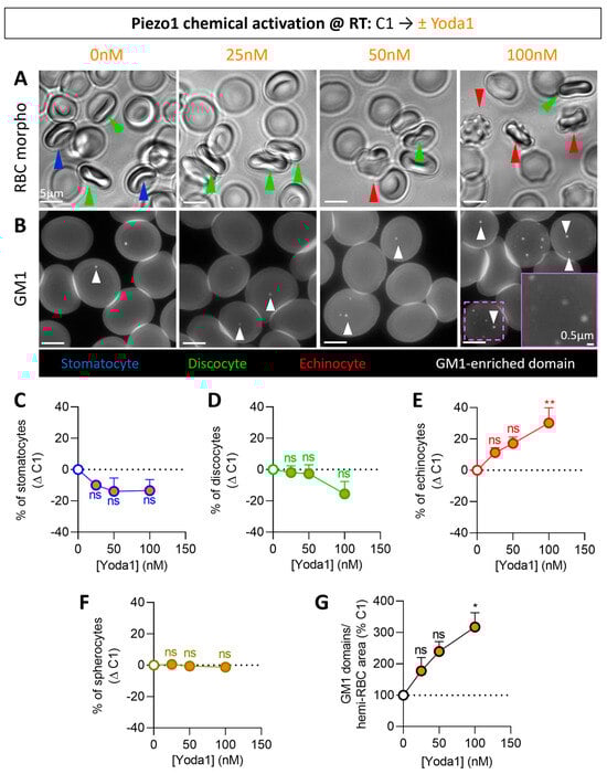 Piezo1 chemical activation by the allosteric modulator Yoda1 dose-dependently increases echinocyte proportion and GM1-enriched domain abundance. RBCs from one healthy donor (C1) were incubated in DMEM at RT for 20 min in suspension and then with Yoda1 for 30 s (white, controls; orange, Yoda1). RBCs were then analyzed for the morphology proportions (A,C–F) and GM1-enriched domains (B,G). (A,C–F) Morphology of RBCs in suspension determined in plastic IBIDI chambers. (A) Representative images. Stomatocytes, blue; discocytes, green; echinocytes, red; spherocytes, brown-yellow. (C–F) Quantification of the proportions of each RBC population per total RBC number. Mean ± SEM of 4 independent experiments where 40–260 RBCs per image were counted. (B,G) Fluorescence imaging of RBCs spread on poly-L-lysine (PLL) and labeled with BODIPY-GM1. (B) Representative images. White arrowheads, GM1-enriched domains in the dimple region. (G) Quantification of domains per hemi-RBC. Mean ± SEM of 4 independent experiments where 50–130 RBCs per image were analyzed. Kruskal–Wallis with Dunn’s multiple comparison test. ns, not significant; *, p < 0.05; **, p < 0.01.