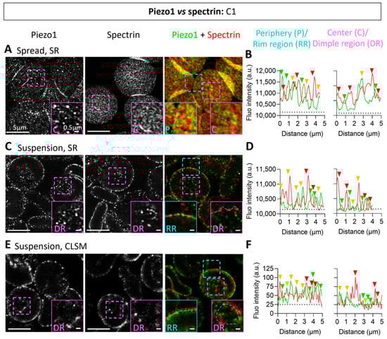 Piezo1 submicrometric clusters present different sizes and association with spectrin in the dimple and the rim regions. RBCs from one healthy donor (C1), either spread and then fixed-permeabilized (Spread) or fixed in suspension and then permeabilized (Suspension), were immunolabeled and analyzed for Piezo1, spectrin or both using super-resolution (SR, A–D) and confocal (CLSM, E,F) microscopy. (A,C,E) Representative images. Left, Piezo1; center, spectrin; right, Piezo1 + spectrin. Blue square, zoom of peripheral (P) or rim region (RR); pink square, zoom of center (C) or dimple region (DR). (B,D,F) Fluorescence intensity profiles were drawn along the rim region or the dimple region to visualize Piezo1 and spectrin. Green, Piezo1; red, spectrin; yellow, Piezo1 and spectrin association. Dotted lines, basal thresholds.