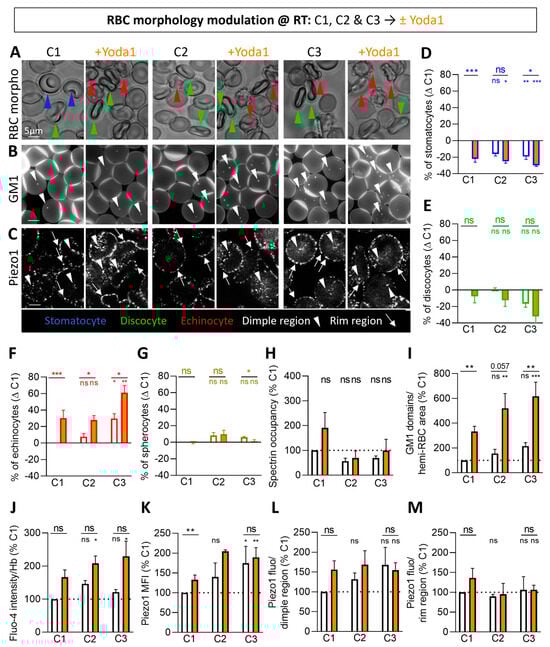 In parallel, we assessed the same parameters upon Piezo1 activation by Yoda1 in RBCs from the three donors. The concentration of 100 nM was selected, except for the Piezo1 distribution, which was assessed at 50 nM Yoda1 to avoid a too high increase in echinocyte proportion resulting from the combined effect of Yoda1 and fixation (Figure S3G). Whatever the donor, Yoda1 increased the echinocyte proportion at the expense of the stomatocytes and discocytes but also the abundance of GM1-enriched domains and the intracellular Ca2+ content (Figure 3A,B,D–G,I,J and Figure S4A–D; orange columns). Conversely, whereas spectrin membrane occupancy increased in C1 upon Yoda1, it was not the case in C2 and C3 (Figure 3H; orange columns). Regarding Piezo1 fluorescence, the effect of Yoda1 was most evident on Piezo1 MFI and fluorescence in the dimple than in the rim, whatever the donor considered. Nevertheless, C1 systematically showed the most pronounced effect (Figure 3C,K–M; orange columns), as for spectrin membrane occupancy.