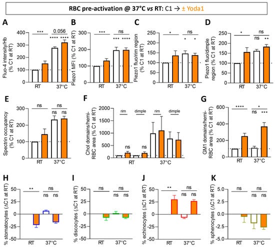 Since the above data were obtained at RT, a temperature at which the plasma membrane Ca2+ ATPase (PMCA) pump is less active [64,65], we then extended our experiments to RBCs pre-incubated at 37 °C before Piezo1 chemical activation. The intracellular Ca2+ was still increased upon Yoda1 treatment of RBCs pre-incubated at 37 °C but to a lower extent than at RT (Figure 4A; orange columns). This lower increase could be explained by the optimal working temperature of the PMCA pump [64,65] but also potentially by Piezo1 pre-activation at 37 °C, as supported by the stronger intracellular Ca2+ level in basal conditions at 37 °C vs. RT (i.e., without Yoda1; Figure 4A; white columns) and the lower increase in Piezo1 fluorescence in the dimple region upon Yoda1 at 37 °C (Figure 4D; orange vs. white columns). Furthermore, the rise in Piezo1 MFI and fluorescence in the rim, of membrane:cytoskeleton anchorage and of chol-enriched domain abundance seen at RT were completely abrogated at 37 °C (Figure 4B,C,E,F), in contrast to the abundance of GM1-enriched domains and the proportion of echinocytes, which were even more highly increased (Figure 4G–K).