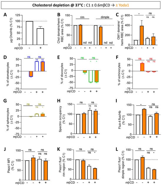 To test the possibility that lipid domains could exhibit lower chol content, the RBC membrane was partially depleted from its chol content through the use of methyl-β-cyclodextrin (mβCD), a treatment previously validated in RBCs but also in myoblasts and breast cancer cell lines [47,66,67]. At both 0.6 and 0.9 mM, the chol content was decreased by ~25% (Figure 5A and Figure S7A). In contrast, the PS surface exposure was increased at 0.9 mM but not at 0.6 mM (Figure S7B); the latter was therefore chosen for subsequent experiments. As expected from a lower membrane chol content, the RBC surface area was decreased by ~15% at 0.6 mM mβCD (Figure S7C) and the chol-enriched domains were completely abrogated in both the rim and the dimple regions (Figure 5B). Conversely, the number of GM1-enriched domains was preserved (Figure 5C; white columns and Figure S7D), suggesting alteration of their chol content. This implies that, if the GM1-enriched domains contribute to Piezo1 activation through their appropriate composition and properties, they should no longer increase in abundance upon Yoda1. This was indeed observed (Figure 5C; orange columns). In addition to the impairment of lipid domains, a rise in stomatocytes and spherocytes at the expense of discocytes was seen (Figure 5D–G and Figure S7D; white columns), suggesting changes in the global membrane properties as well. In contrast, morphological changes were unaffected by Yoda1 (Figure 5D–G; orange columns), as was the spectrin membrane occupancy (Figure 5H).