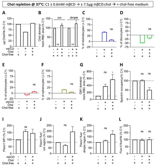 Upon cholesterol repletion, chol-enriched domains, RBC morphology and Piezo1 fluorescence in the rim are improved but not GM1-enriched domains and Piezo1 MFI and fluorescence in the dimple. RBCs from one healthy donor (C1) were either left untreated (1st column) or incubated with mβCD for 15 min followed or not (2nd column) by treatment with mβCD:chol for 60 min (3rd column). All RBCs were then re-incubated in a chol-free medium for 90 min and analyzed for the membrane chol content (A), lipid domains (B,G), RBC morphology (C–F), spectrin occupancy (H), Piezo1 fluorescence (I–K) and Ca2+ levels (L). (A) Membrane chol content determined by fluorimetry and normalized to Hb content. One experiment. (B,G) Quantification of chol-enriched domains in the rim and the dimple regions as in Figure 4F (B) and GM1-enriched domains in the dimple region as in Figure 1G (G). Mean ± SD of 2 independent experiments where 40–100 RBCs per image were analyzed (B). nd, non-detectable. Mean ± SEM of 3–4 independent experiments where 60–325 RBCs per image were analyzed (G). (C–F) Quantification of the proportions of each RBC population per total RBC number determined as in Figure 1C–F. Mean ± SD of 2 independent experiments (except for repletion conditions, mean ± SEM of 3) where 145–195 RBCs per condition were analyzed. (H) Quantification of spectrin membrane occupancy determined as in Figure 3H. Mean ± SEM of 3 independent experiments where 18–75 RBCs per condition were analyzed. (I–K) Quantification of Piezo1 MFI (I) and total intensity in the rim and the dimple regions (J,K) determined as in Figure 3K–M. Mean ± SEM of 3–6 independent experiments (except for control repletion condition, mean ± SD of 2) where 9–14 confocal images (I) and 4–24 RBCs (J,K) were analyzed. (L) Intracellular Ca2+ levels at 37 °C determined by fluorimetry and normalized to Hb content. Mean ± SEM of 3–5 independent experiments. Kruskal–Wallis with Dunn’s multiple comparison and Mann–Whitney test. ns, not significant; *, p < 0.05.