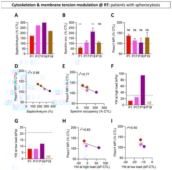 The differential impairment of RBC cytoskeleton in four patients with hereditary spherocytosis correlates with differential alterations in Piezo1 fluorescence and plasma membrane stiffness. RBCs from patients with hereditary spherocytosis (P1, red; P17, pink; P18, purple; P19, brown) were compared to sex-matched controls and analyzed for the septin/ankyrin content ratio (A), spectrin membrane occupancy (B), Piezo1 MFI (C) and PM stiffness (F,G). (A) Ratio of septin-8 over ankyrin expression. Reproduced and adapted from [57]. (B) Quantification of spectrin membrane occupancy. Reproduced and adapted from [57]. (C) Quantification of Piezo1 MFI determined as in Figure 3K. Mean ± SEM of 3 independent experiments where 4–11 confocal images per condition were analyzed. (D,E) Correlations between Piezo1 MFI and the septin/ankyrin ratio (D) and the spectrin occupancy (E). (F,G) Force–distance analysis by atomic force microscopy (AFM) at high and low loads and determination of the Young’s modulus (YM). (H,I) Correlations between Piezo1 MFI and the YM at high load (H) and low load (I). Mann–Whitney test. ns, not significant; **, p < 0.01.