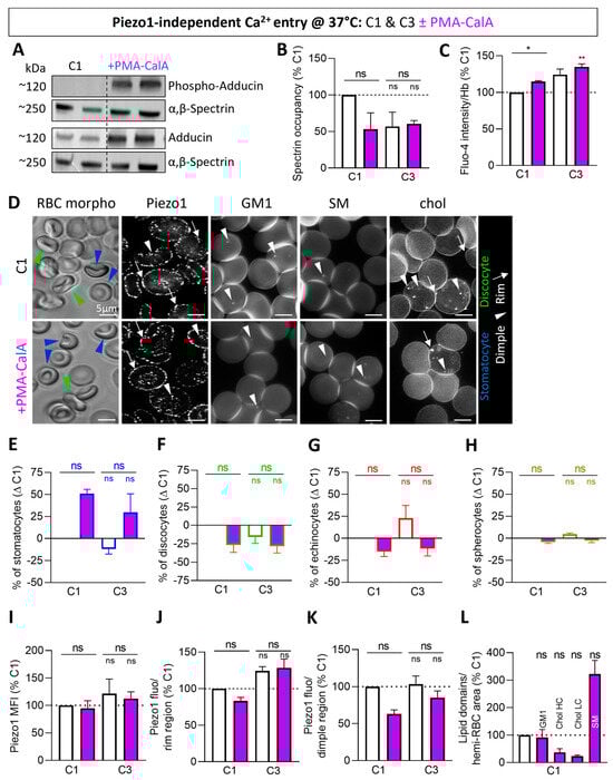 Upon Piezo1-independent calcium influx, neither echinocytes, nor Piezo1 fluorescence nor GM1- and chol-enriched domains increase. RBCs from two healthy donors (C1 and C3) were incubated at 37 °C with phorbol myristate-13-acetate (PMA) combined with calyculin A (CalA) for 20 min in suspension (white, controls; purple, PMA-CalA). RBCs were then analyzed for phospho-adducin (A), spectrin membrane occupancy (B), intracellular Ca2+ levels (C), morphology (D–H), Piezo1 fluorescence (D,I–K) and lipid domains (D,L). (A) Western Blotting of RBC ghosts analyzed in a 4–15% SDS-PAGE for expression of α-adducin, α-phospho-adducin or α-β-spectrin proteins. The spectrin expression was used as the control of charge. (B) Quantification of spectrin membrane occupancy determined as in Figure 3H. Mean ± SEM of 3 independent experiments where 18–46 RBCs per condition were analyzed. (C) Intracellular Ca2+ levels determined by fluorimetry and normalized to Hb content. Mean ± SEM of 3 independent experiments. (D–H) Morphology of in suspension RBCs determined in plastic IDIBI chambers. (D) Representative images and (E–H) quantification as in Figure 1A,C–F. Stomatocytes, blue; discocytes, green. Mean ± SEM of 3 independent experiments where 85–215 RBCs per condition were analyzed. (D,I–K) Confocal imaging of Piezo1 on fixed and permeabilized RBCs. (D) Representative images and (I–K) quantification as in Figure 3C,K–M. White arrowheads, Piezo1 clusters in the dimple region; white arrows, Piezo1 clusters in the rim region. Mean ± SEM of 3 independent experiments where 12 confocal images (I) and 23–55 RBCs (J,K) were analyzed. (D,L) Fluorescence imaging of RBCs labeled with BODIPY-GM1 or BODIPY-SM or with the mCherry-Theta toxin fragment for endogenous chol decoration. (D) Representative images and (L) quantification of GM1- and SM-enriched domains as in Figure 1B,G and of chol-enriched domains in the rim and the dimple regions as in Figure 4F. Mean ± SEM of 3–4 independent experiments where 75–140 RBCs per fluorescent images were analyzed. Kruskal–Wallis with Dunn’s multiple comparison and Mann–Whitney test. ns, not significant; *, p < 0.05; **, p < 0.01.