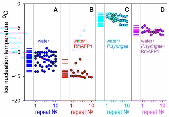 Experiments on the effect of an antifreeze protein RmAFP1 on ice nucleation. We have performed 2–5 series of experiments for each liquid (A–D); each series consisted of 10 or more repeats of a cycle of cooling, alternated with heating, without replacing the liquid sample and test tube—as in the experiment demonstrated in panel (B) in Figure 1. The repeat No in each of the series for each liquid is indicated at the bottom of each panel. (A) Water without any proteins, pH 7.0. (B) Water supplemented with 0.04 mg/mL RmAFP1. (C) Water with P. syringae as an ice nucleator (cf. Figure 1E). (D) Water with the nucleator P. syringae supplemented with an antifreeze protein RmAFP1 (0.04 mg/mL). The repeats after No 10 are not shown in the panels for the sake of compactness, but columns of short lines on the left part of the panels indicate the experimental nucleation temperatures found in all repeats of all experiments. The figure shows that, although the antifreeze protein RmAFP1 altered the ice nucleation temperatures in the absence of P. syringae ice nucleator, the impact of RmAFP1 is even more pronounced in the presence of the ice nucleator, because the ± deviations are twice smaller in the latter case.