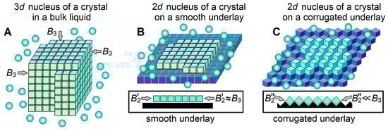Thus, any ice-binding surface, including that of a plastic test tube or some dust particles, serves as an ice nucleator but its catalytic effect on the ice emergence is determined solely by the temperature and the free energy of the border of the arising ice, i.e., by the B2 factor (see Equations (10) and (11)). The latter depends on the orientation of molecules forming the layer of ice arising on the underlay. A special shape of the underlay (cf. Figure 4C with Figure 4B) can significantly weaken the contacts between ice molecules inside the newly arising ice layer, and accordingly, reduce the values of the boundary factors. In turn, the smaller strongly decreases the freezing temperature, thereby drastically shortening the freezing time at a given temperature. The faster ice formation on surfaces corrugated at an atomic scale has been already experimentally observed []. Thus, the special atomic structure of the underlay can create a powerful “ice nucleator” in contrast to the plastic walls of the test tubes, which are “weak ice nucleators”.