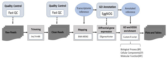 Raw reads were processed using a bioinformatic pipeline, as indicated in Figure 1. To obtain high-quality clean reads, the raw reads were pre-processed with SeqTrimBB (v2.1.8), and mapping was performed with BWA-MEM2 (v2.2.1). To identify differentially expressed genes (DEGs) across samples or groups, DEgenesHunter (v1.0) software was employed. Genes were considered as differentially expressed (DEG) if the [fold-change] > 1.5 and the adjusted p-value < 0.05 (calculated with the false discovery rate (FDR)). Three comparisons between dietary treatments were carried out: ‘Medium Diet’ vs. ‘Reference Diet’ (MD vs. RD), ‘High Diet’ vs. ‘Reference Diet’ (HD vs. RD), and ‘High Diet’ vs. ‘Medium Diet’ (HD vs. MD).