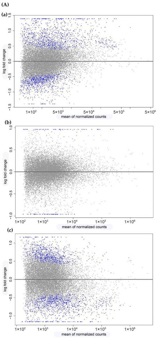 To identify DEGs in the Argyrosomus regius larvae during development, pair-wise comparisons were performed among the different dietary treatments. The impact on total transcriptome expression and the number of DEGs obtained from the different comparisons can be observed in the MA plots (Figure 2A). A high proportion of DEGs was found when the Medium Diet and Reference Diet were compared (648 up- and 441 down-regulated, Figure 2(Aa)) and when the High Diet and Medium Diet were compared (345 up- and 618 down-regulated, Figure 2(Ac)). However, a significantly lower number of DEGs (50 up- and 30 down-regulated Figure 2(Ab)) was found after a comparison between the HD and MD. Using Venn diagram analysis (Figure 2B), it was observed that there were only three DEGs overlapped among the three comparisons between diets. Furthermore, 457 DEGs overlapped between the comparisons MD vs. RD and HD vs. MD, 5 overlapped between the comparisons HD vs. RD and HD vs. MD, and 47 DEGs overlapped between the comparisons MD vs. RD and HD vs. RD. Furthermore, 582 DEGs were identified uniquely in MD vs. RD, 498 DEGs were identified uniquely in HD vs. MD, and 25 were identified uniquely in HD vs. RD.