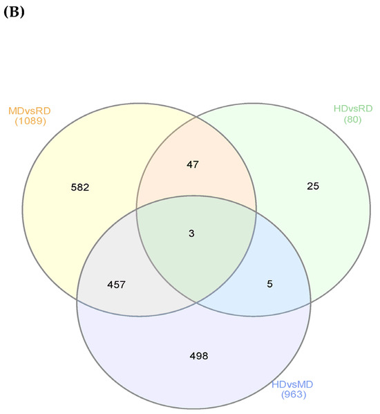 Visualization of gene expression datasets in Argyrosomus regius larvae fed with different level of Omega-3 (commercial, medium, and high) at 28 DAH. (A) These figures show the plots of log2 fold-change against mean of normalized counts (MA plot) of all transcriptome genes from pairwise comparisons: (a) MD vs. RD, (b) HD vs. RD, and (c) HD vs. MD. Blue dots represent genes that passed the threshold FC > 1.5 (p.adj < 0.05, false discovery rate correction, FDR). Grey dots represent expressed genes that did not pass the thresholds in order to be considered true DEGs. MD, Medium Diet; HD, High Diet; RD, Reference Diet. (B) Venn diagram of the number of genes declared as true DE for each comparison. The figure shows shared and unique DEGs obtained in the pairwise comparisons between treatments. The number of true DE genes that were obtained in MD vs. RD is surrounded in orange. The number of true DE genes that were obtained in HD vs. RD is surrounded in green, and the number of true DE genes that were obtained in HD vs. MD is surrounded in blue.