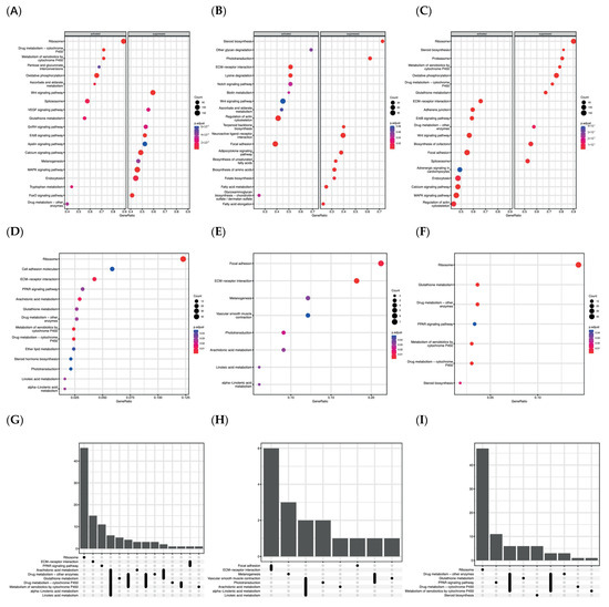 Kyoto Encyclopedia of Genes and Genomes (KEGG). KEGG pathway functional analysis of differentially expressed genes during skeletal development of Argyrosomus regius fed with different Omega-3 dietary levels at 28 DAH. (A–C) represent facet dot-plots of nominally significant up-regulated and down-regulated KEGG pathways enriched among all expressed genes in the different comparisons MD vs. RC, HD vs. RD, and HD vs. MD according to GSEA results. (D–F) dot-plots represent the most enriched KEGG pathways among all differently expressed genes in the different comparisons MD vs. RC, HD vs. RD, and HD vs. MD, according to ORA results. In all these cited figures, the x-axis shows the ratio of differentially expressed genes in each term relative to the total number of genes in that term. The y-axis represents the term associated to each enriched pathway. The size of the dot indicates the number of differentially expressed genes in that term, and the color of the dot shows the pathway enrichment significance according to p-value. (G–I) Upset-plots presented the number of common elements among GO terms in our functional enrichment analysis for each comparison of MD vs. RD, HD vs. RD, and HD vs. MD, respectively. The vertical bars indicate the common elements in the sets, indicated with dots under each bar. The single points represent the number of unique elements in each group.