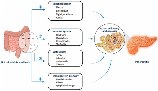 The implementation of the Human Microbiome Project has contributed to the rapid development of the field of gut microbiology. Microbes mediate bidirectional communication between the intestine and organs such as the liver and lungs that affect the development of alcoholic liver disease, cirrhosis, and chronic obstructive pulmonary disease [,]. Targeting these gut–organ axes to treat diseases outside the gut is proving effective [,]. Similarly, interactions between the gut and pancreas have been studied in both pancreatic diseases and normal physiological states []. These findings support the hypothesis that the “gut–pancreas axis” determines the onset and progression of AP (Figure 1).