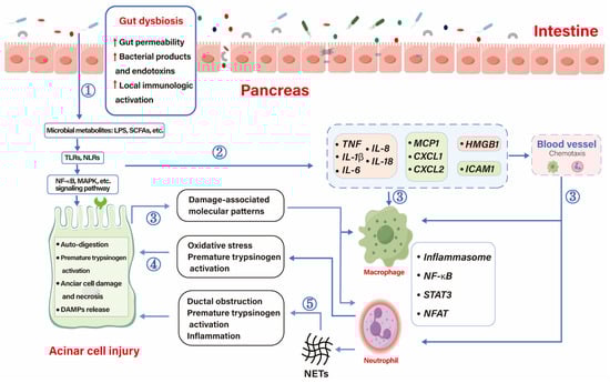 Initiation and immunoinflammatory processes influenced by AP. ① Gut dysbiosis leads to increased permeability, local immune activation, and translocation of bacteria and their products and toxins, such as SCFAs and LPS, which aggravate acinar cell damage through interaction with signaling pathways on acinar cells. ② Bacteria, metabolites, and damaged acinar cells promote the release of cytokines, chemokines, adhesion molecules, and injury-related molecular patterns that recruit immune cells to the pancreas. ③ Once recruited, chemokines, cytokines, and damage-associated molecular patterns around acinar cells activate immune cells and amplify the inflammatory response. ④ Macrophages amplify the inflammatory response through NF-κB, STAT3, neutrophils cause premature activation of trypsin, and acinar cells injury through oxidative stress. ⑤ Neutrophils can also cause duct obstruction, premature activation of pancreatic enzymes and amplify inflammatory responses by releasing NETs.