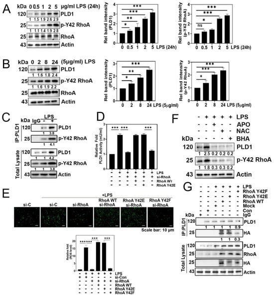 LPS significantly increased both p-Tyr42 RhoA and PLD1 levels in concentration- and time-dependent manners (Figure 2A,B, respectively). Building on prior research indicating the interaction between RhoA-GTP and PLD1, leading to PLD1 enzyme activation, we investigated whether p-Tyr42 RhoA interacts with PLD1. In response to LPS, PLD1 co-immunoprecipitated with p-Tyr42 RhoA, indicating an interaction between PLD1 and p-Tyr42 RhoA (Figure 2C). Remarkably, the knockdown of RhoA with siRNA led to a reduction in PLD1 enzyme activity, while reconstitution with RhoA WT and the RhoA Y42E phospho-mimetic form restored its activity. Notably, the RhoA Y42F dephospho-mimetic did not restore PLD1 activity, emphasizing the critical role of the p-Tyr42 residue in RhoA for PLD1 enzyme activity (Figure 2D). Next, we investigated whether the p-Tyr42 residue of RhoA is pivotal for superoxide generation. RhoA knockdown with siRNA and reconstitution with the RhoA Y42F dephospho-mimic form suppressed superoxide production, whereas reconstitution of RhoA WT and the Y42E phospho-mimic form restored its generation (Figure 2E). Additionally, agents that mitigate ROS levels attenuated the levels of p-Tyr42 RhoA and PLD1 (Figure 2F). The noteworthy observation was that PLD1 co-immunoprecipitated with both RhoA WT and RhoA Y42E, a phospho-mimicking variant, while no interaction was detected with RhoA Y42F, a dephospho-mimicking variant. (Figure 2G). This implies that the phosphorylation of Ty42 in RhoA plays a pivotal role in this interaction with PLD1.