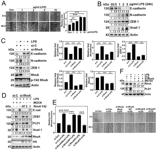 EMT and cell migration are facilitated by p-Tyr42 RhoA. (A) A549 cells were exposed to varying concentrations of LPS (0–10 μg/mL) for 48 h. Cell migration was evaluated at 0 and 48 h by observing under a microscope after scratching with a plastic pipette tip. (B) After treating A549 cells with LPS (0–5 μg/mL at different concentrations for 24 h), the expression levels of E-cadherin, N-cadherin, ZEB1, and Snail were examined through immunoblotting. (C) A549 cells were transfected with si-Con (20 nM) and si-RhoA (50 nM) for 48 h, followed by an 8 h starvation period before stimulation with LPS (5 μg/mL) for 24 h. Immunoblotting was employed to detect the expression of E-cadherin, N-cadherin, ZEB1, RhoA, and p-Y42 RhoA, which were subsequently plotted in a bar diagram. (D,E) After transfection with si-con (20 nM) and si-RhoA (50 nM) for 48 h, A549 cells underwent additional transfection with Mock, RhoA WT, Y42E, and Y42F plasmid DNA (2 μg) for 24 h. Subsequently, the cells were stimulated with 5 μg/mL LPS for 24 h. (D) Western blot analysis was employed to assess the levels of E-cadherin, N-cadherin, ZEB1, PLD1, Snail 1, HA, RhoA, and Actin as a loading control. (E) Cell migration was evaluated according to the methods described in (A). (F) A549 cells, transfected with si-con (20 nM) and si-RhoA (50 nM), were subjected to stimulation with LPS (5 μg/mL) in the presence of MG132 (1 μM) for 48 h. Changes in the levels of RhoA and PLD1 were assessed through Western blotting. The data are the mean ± SD of three independent experiments (*, p < 0.05; **, p < 0.01, and ***, p < 0.001) in case without particular remark. Ns typically stands for non-significant, indicating that there is no significant difference or effect observed. Scale bars were indicated in the below each relevant figure. The Western blot results are indicative of a minimum of three independent experiments.
