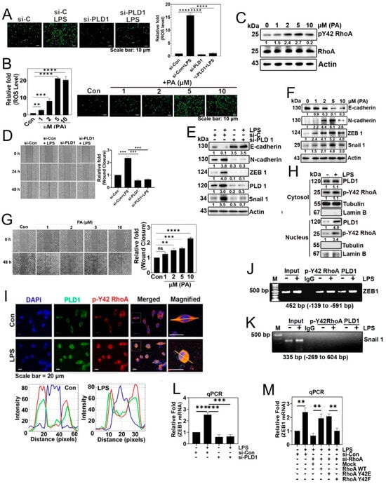 p-Tyr42 RhoA and PLD1 bind to the promoter of ZEB1, influencing cell migration. (A) A549 cells were transfected with si-Con (20 nM) and si-PLD1 (50 nM) for 48 h. Following 12 h of starvation, cells were stimulated with LPS (5 μg/mL) for 24 h to assess ROS generation using DCFDA, as depicted in Figure 1A. (B,C) A549 cells were activated with various concentrations of phosphatidic acid (PA) (0–10 μM) for 24 h. (B) ROS levels were then quantified as mentioned previously in Figure 1A. (C) Western blot analysis was performed to determine the expression levels of RhoA and p-Y42 RhoA. (D,E) A549 cells were transfected with si-Con (20 nM) and si-PLD1 (50 nM) for 48 h. After 12 h of starvation, cells were stimulated with LPS (5 μg/mL) for 24 h. (D) Cell migration rate was assessed according to Figure 3A. (E) Immunoblotting was conducted to determine the expression levels of E-cadherin, N-cadherin, ZEB1, PLD1, Snail 1, and Actin as a loading control. (F,G) A549 cells stimulated with various concentrations of PA (0–10 μM) for 24 h. (F) Immunoblotting was utilized to measure the expression levels of E-cadherin, N-cadherin, ZEB1, Snail 1, and Actin as a loading control. (G) Cell migration was measured as depicted in Figure 3A. (H) A549 cells were treated with LPS (5 μg/mL) for 24 h. Subsequently, cytosolic and nuclear fractions were isolated, and Western blotting was performed to identify PLD1 and p-Y42 RhoA. Lamin B and tubulin expression levels served as loading controls for the nuclear and cytosolic fractions, respectively. (I) A549 cells were cultured for 24 h, and following a 12 h period of serum starvation, the cells underwent stimulation with LPS (5 μg/mL) for 24 h. Subsequently, the cells were treated with 5 μg/mL of p-Y42 RhoA (Rabbit antibody) and 5 μg/mL of PLD1 (mouse antibody), and incubated overnight at 4 °C. The co-localization of PLD1 (green) and p-Y42 RhoA (red) was examined using confocal microscopy, with the nucleus labeled using 5 μg/mL DAPI (blue). White lines intersecting cells were used to measure the fluorescence intensity. (J,K) ChIP-PCR experiments were conducted on A549 cells exposed to LPS (5 μg/mL) for 24 h, using primers specific for ZEB1 (J) and Snail 1 (K), aiming to investigate the binding of p-Y42 RhoA and PLD1. (L) A549 cells were transfected with si-Con (20 nM) and si-PLD1 (50 nM) for 48 h. Following 12 h of starvation, cells were then stimulated with LPS (5 μg/mL) for 24 h. Subsequently, ZEB1 mRNA expression was quantified using qPCR. (M) Following transfection with si-con (20 nM) and si-RhoA (50 nM) for 48 h, A549 cells were subjected to additional transfection with Mock, RhoA WT, Y42E, and Y42F plasmid DNA (2 μg) for 24 h. Subsequently, the cells were stimulated with 5 μg/mL LPS for an additional 24 h. The expression of ZEB1 mRNA was evaluated using qPCR. The data are the mean ± SD of three independent experiments (**, p < 0.01; ***, p < 0.001; and ****, p < 0.0001) in case without particular remark. Scale bars were indicated in the below each relevant figure. Western blot data are representative of at least three independent experiments.